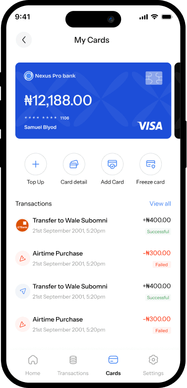 The Card screen gives users complete control over how their card is used. From freezing and unfreezing to setting spending limits and seeing real-time card activity, users can manage their security independently. This removes the need for support calls and builds trust by letting them take immediate action when needed.